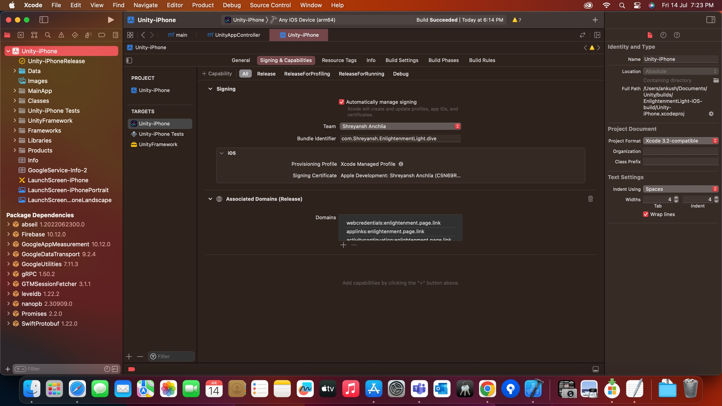 Unity iPhone > Signing & Capabilities > All > +Add Capacity > Associated Domains:
