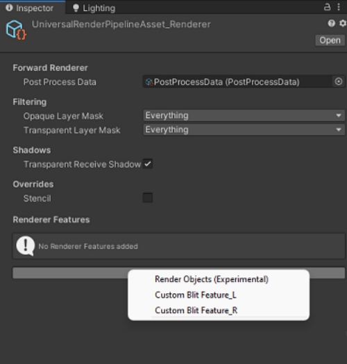 Add the custom render features, CustomBlitFeature_L & CustomBlitFeature_R to your pipeline asset renderer. In this case, we have UniversalRenderPipelineAsset_Renderer.
