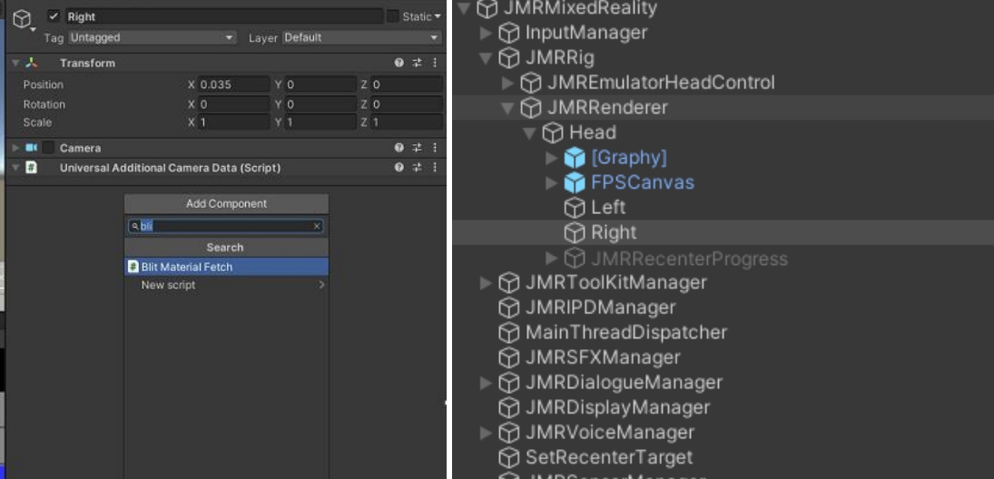 Add BlitMaterialFetch script to the Left and Right Camera in JMRMixedReality prefab under JMRRig -> JMRRenderer -> Head. This script will be in the JMRSDK_URP_Extension folder which you will get after installing the JMRSDK_URP package.