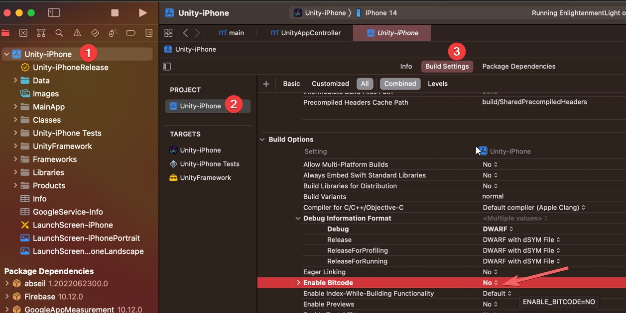 Select Unity-iPhone, there you will get the Build Settings, and set the "Enable Bitcode" to no.