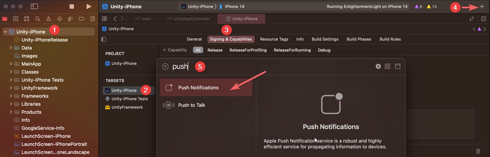 Add push notification from the signing and bundle, while selecting the Unity-iPhone.