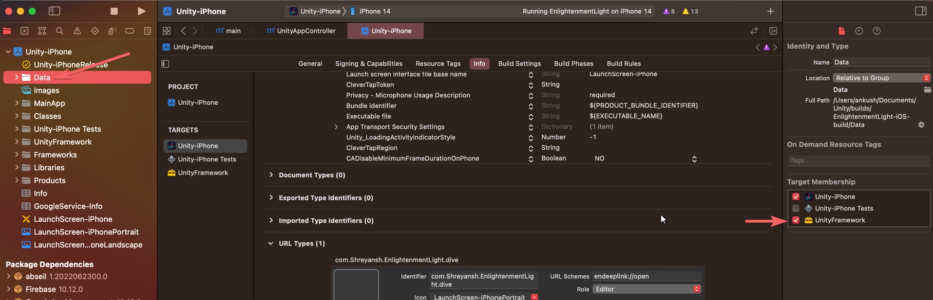 Select the data folder under the project tab, there you will get multiple checkboxes for target membership. Select Unity-iPhone and UnityFramework
