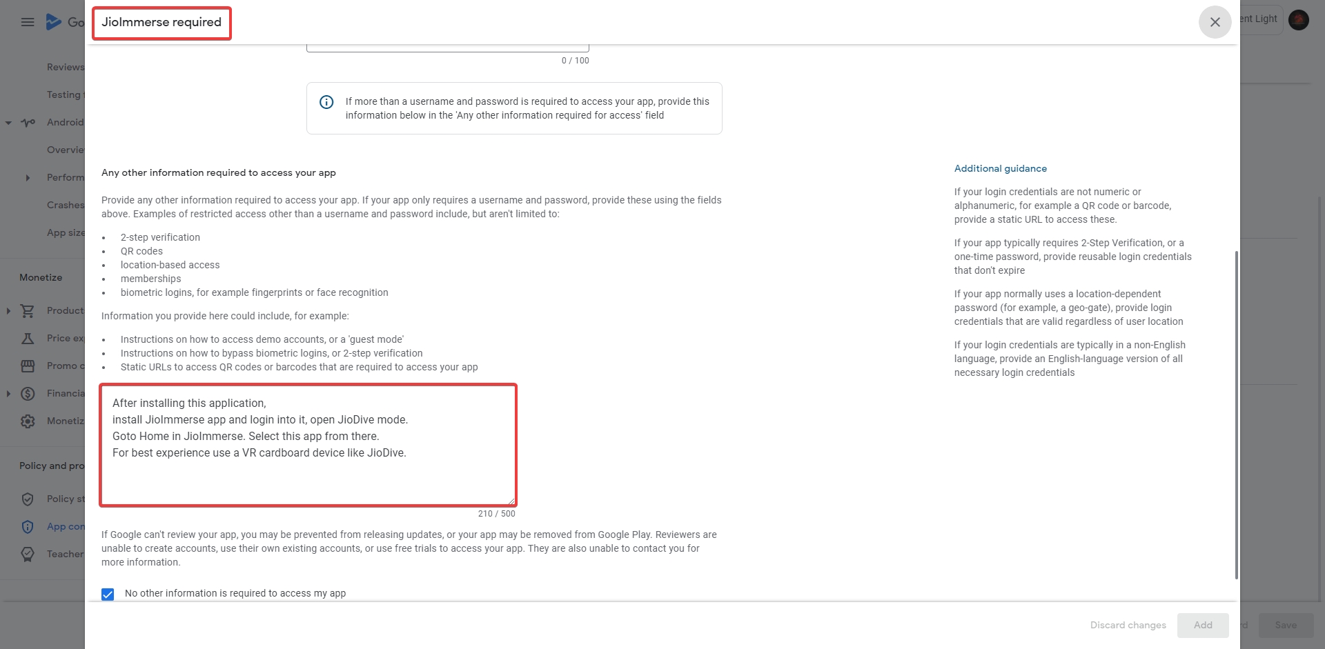 In the Play Console, it has to be mentioned that the application will not work without the JioImmerse application, as it will cause issues with their testing process.