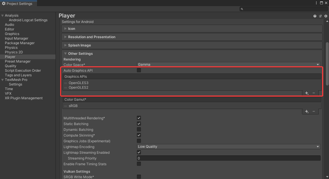 - Under the Other Settings tab, set the Graphics APIs to Vulkan and OpenGLES3 and/or OpenGLES2.