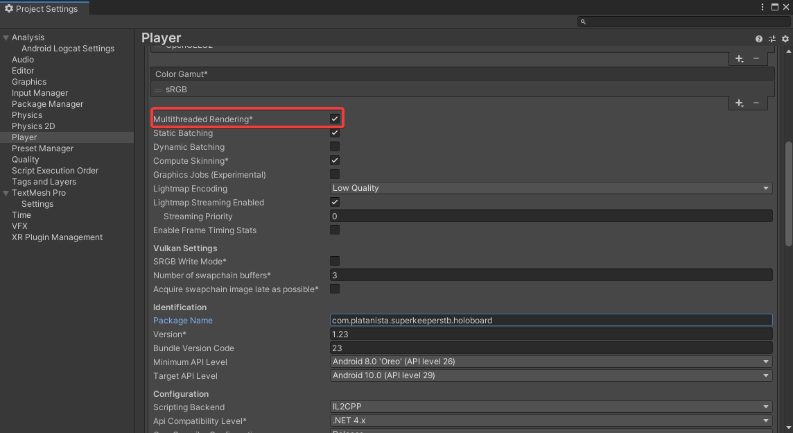 - Under the Other Settings tab, deselect the Multithreaded Rendering, if you are using Camera or Mediaplayer.