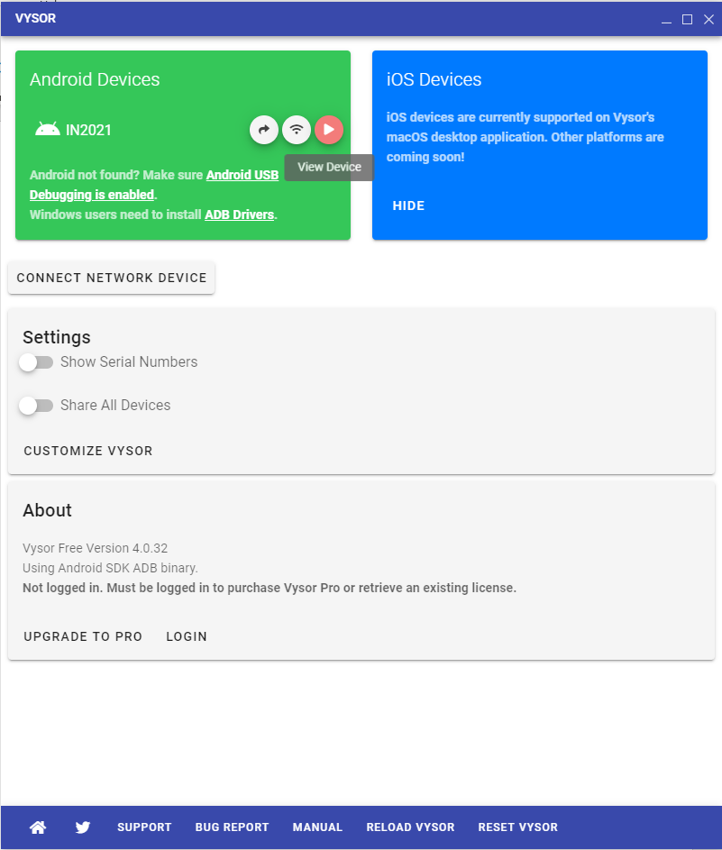 - Your android device will be automatically detected by the Vysor. In case Android device not detected, follow these steps mentioned in this link