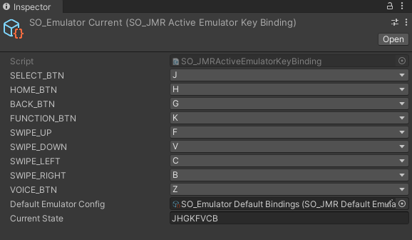 To change these bindings go to Assets > JMRSDK > Emulator > Data > SO_Emulator Current and change the bindings in the scriptable object.