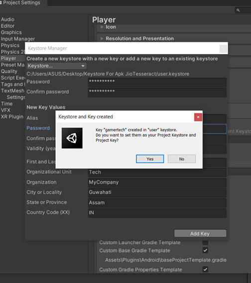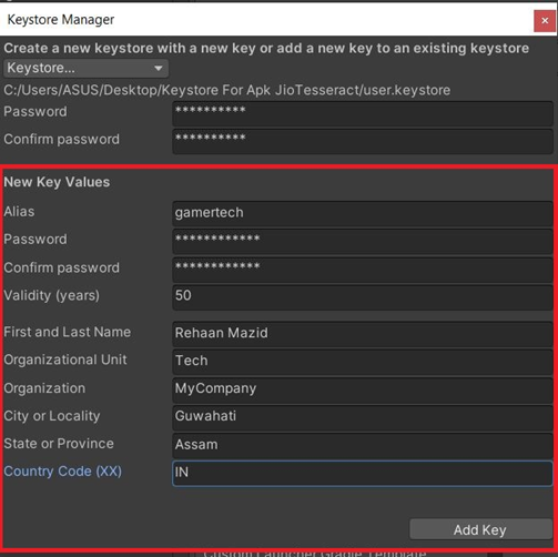 6. Enter your Alias, Password, Validity (Keep it 50 years), First and Last Name, Organizational Unity, Organization, City, State, and Country Code.