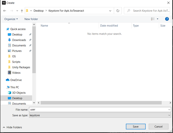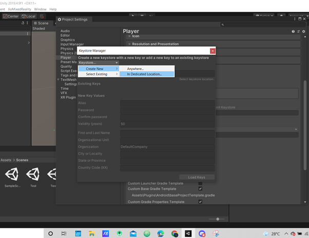 3. Select Keystore > Create New > In Dedicated Location to generate a new Keystore.