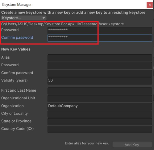5. Enter a password for your Keystore. Password must be at least 6 characters long.