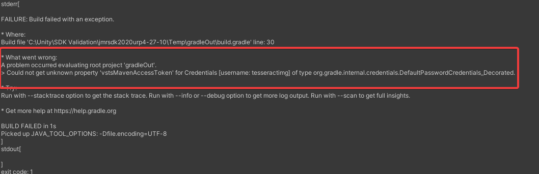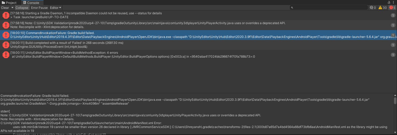 While building if you get Gradle Build failure, you will get multiple error logs in the unity console. There can be multiple reasons why you are getting these errors.
