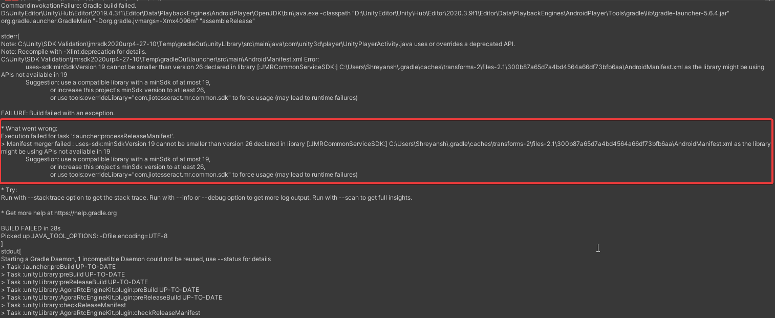 JMRSDK has a dependency on SDK version 28 and hence build will fail when the minimum API version specified in project settings will be smaller than version 28.